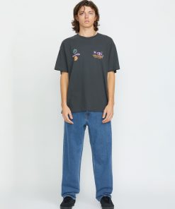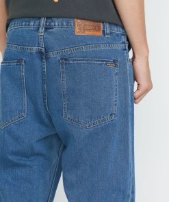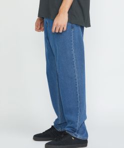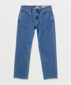 Soft cotton-recycled polyester blend denim with relaxed tapered fit, 16" leg. Eco-friendly wash process, vintage-inspired indigo wash, charcoal topstitch. Volcom’s signature styling, ultimate casual comfort.