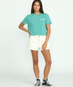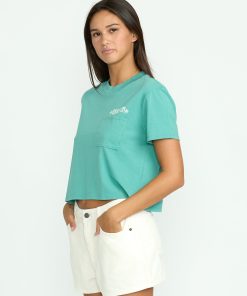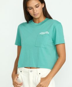 An organic cotton jersey (100% organic cotton, 145g-m2) tee with a relaxed yet modern look-featuring a rib neckband, chest pocket, interior striped neckband detail and screen-print graphic.